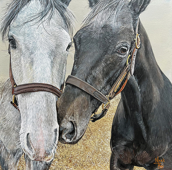 Two horses stand closely together, showcasing their detailed features and gentle expressions.