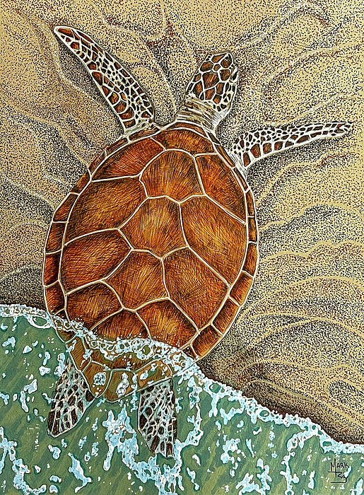 A Green Sea Turtle is depicted coming ashore to nest and lay her eggs